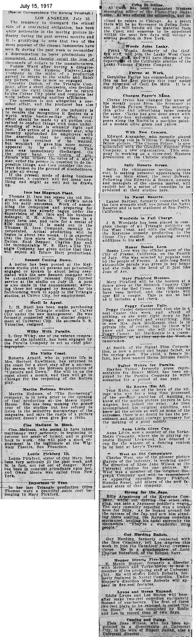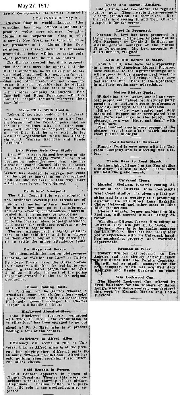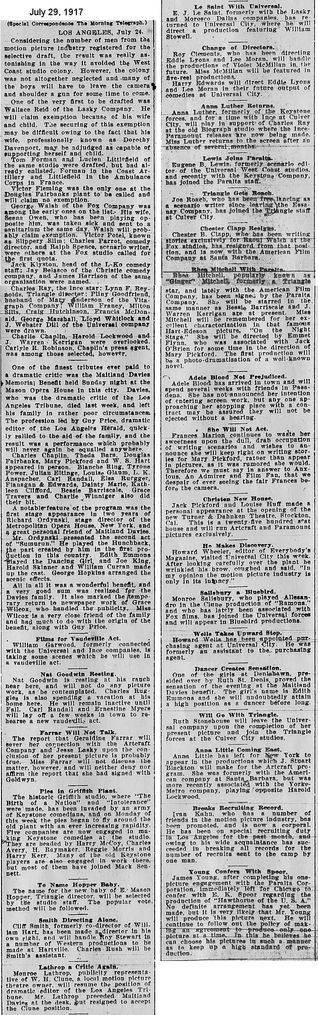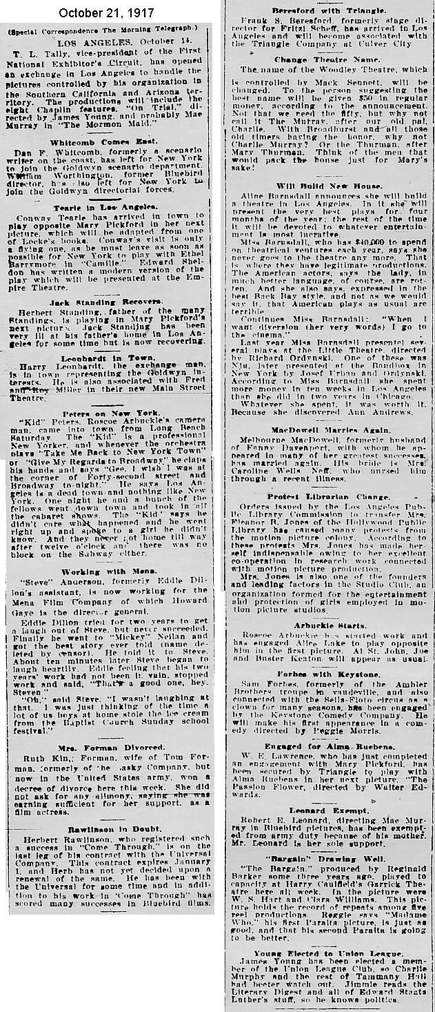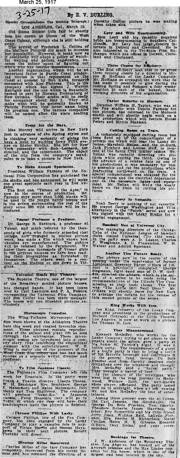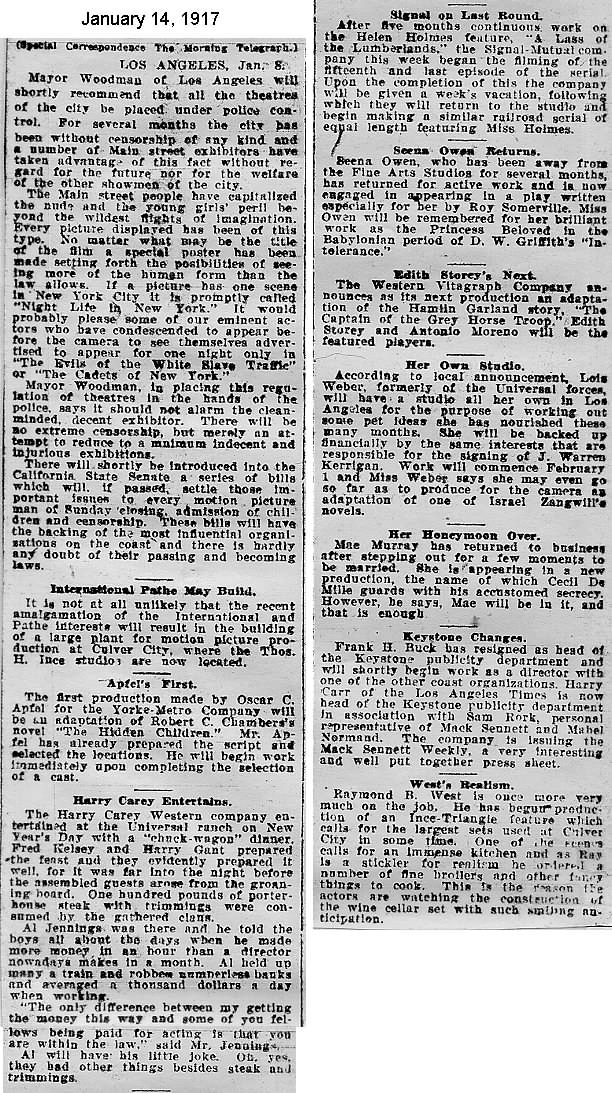 During the silent film era, the New York Morning Telegraph had more coverage of the film industry than any other daily New York newspaper; its coverage included a weekly column of movie news from Los Angeles, initially titled “Pacific Coast News.” As the film industry in Hollywood expanded, that column also grew in size. Many of the “news items” came directly from publicity agents, but they still provide a useful historic glimpse into Hollywood’s growing silent film industry. Major Hollywood news stories would have been given separate articles instead of a mention inside this column. The columnists of “Pacific Coast News” included Edward V. Durling, Clem Pope, Margaret Ettinger and Frances Agnew. During the 1980s, when I was seeking information on the film career of William Desmond Taylor, I cast my research net through a good number of newspapers, fan magazines, and movie trade publications. Since Taylor was directing in Southern California, I was surprised to find so many items on Taylor in the New York Morning Telegraph, which I had examined on microfilm obtained through interlibrary loan. Those columns of “Pacific Coast News” had so much information, and were so useful to me, that I photocopied them for future silent film references. Now, instead of just gathering dust in my garage, I have scanned those 1914-1922 “Pacific Coast News” columns for the web, so that anyone who is interested in silent film history will have access to the material. I did not photocopy the columns beyond February 1922, and the column was occasionally missing from the microfilm source material. Obviously, this material would be more useful if it were turned into word-searchable text instead of images. With the increasing availability of large amounts of free web space such as the Internet Archive, all available contemporary publications on silent film should be scanned and made freely available online, and I encourage people with copies of other contemporary silent film material to do so. In any event, I hope some of you will find useful information in these columns from the New York Morning Telegraph.