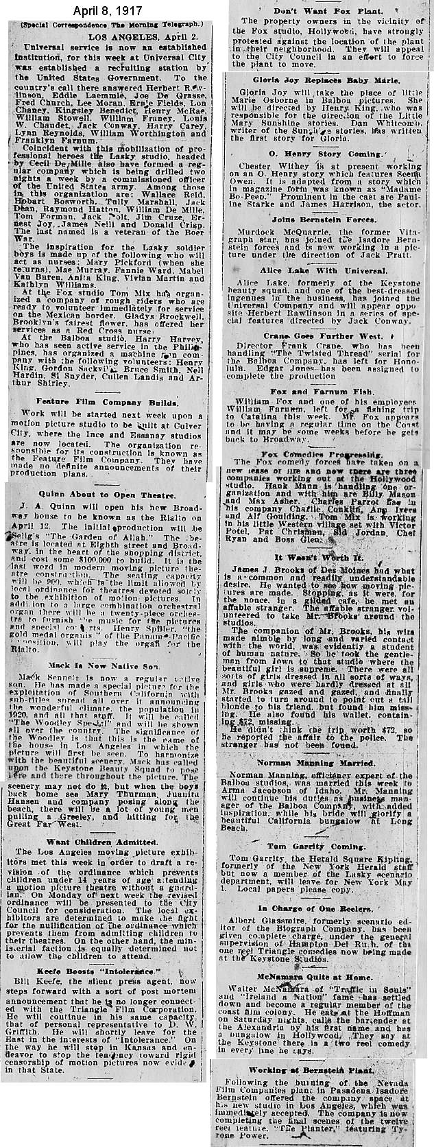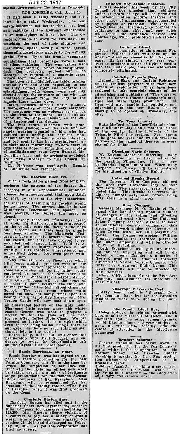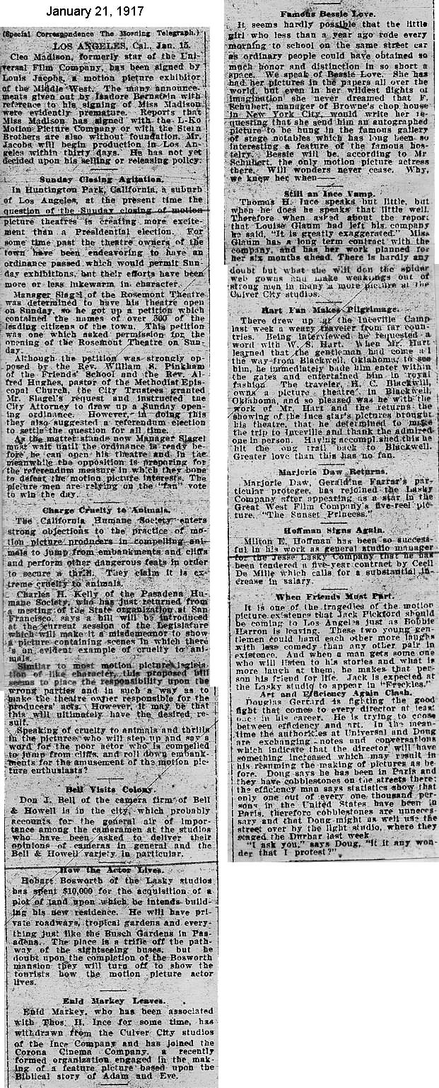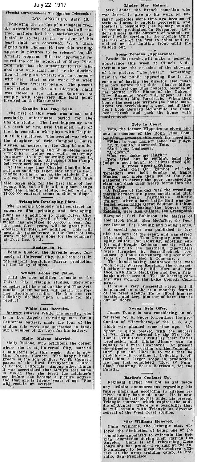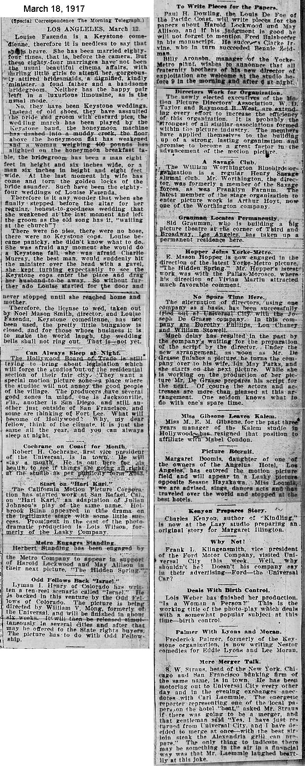 During the silent film era, the New York Morning Telegraph had more coverage of the film industry than any other daily New York newspaper; its coverage included a weekly column of movie news from Los Angeles, initially titled “Pacific Coast News.” As the film industry in Hollywood expanded, that column also grew in size. Many of the “news items” came directly from publicity agents, but they still provide a useful historic glimpse into Hollywood’s growing silent film industry. Major Hollywood news stories would have been given separate articles instead of a mention inside this column. The columnists of “Pacific Coast News” included Edward V. Durling, Clem Pope, Margaret Ettinger and Frances Agnew. During the 1980s, when I was seeking information on the film career of William Desmond Taylor, I cast my research net through a good number of newspapers, fan magazines, and movie trade publications. Since Taylor was directing in Southern California, I was surprised to find so many items on Taylor in the New York Morning Telegraph, which I had examined on microfilm obtained through interlibrary loan. Those columns of “Pacific Coast News” had so much information, and were so useful to me, that I photocopied them for future silent film references. Now, instead of just gathering dust in my garage, I have scanned those 1914-1922 “Pacific Coast News” columns for the web, so that anyone who is interested in silent film history will have access to the material. I did not photocopy the columns beyond February 1922, and the column was occasionally missing from the microfilm source material. Obviously, this material would be more useful if it were turned into word-searchable text instead of images. With the increasing availability of large amounts of free web space such as the Internet Archive, all available contemporary publications on silent film should be scanned and made freely available online, and I encourage people with copies of other contemporary silent film material to do so. In any event, I hope some of you will find useful information in these columns from the New York Morning Telegraph.