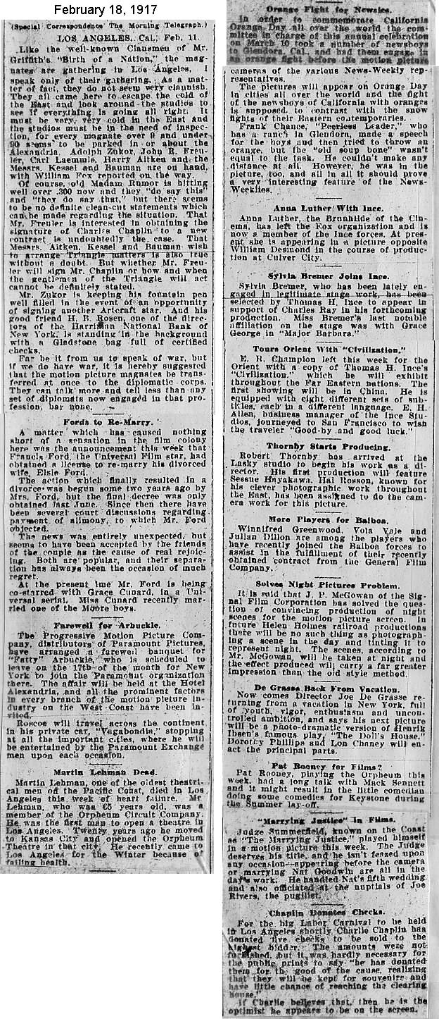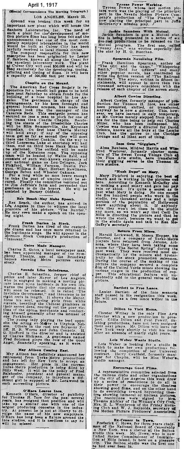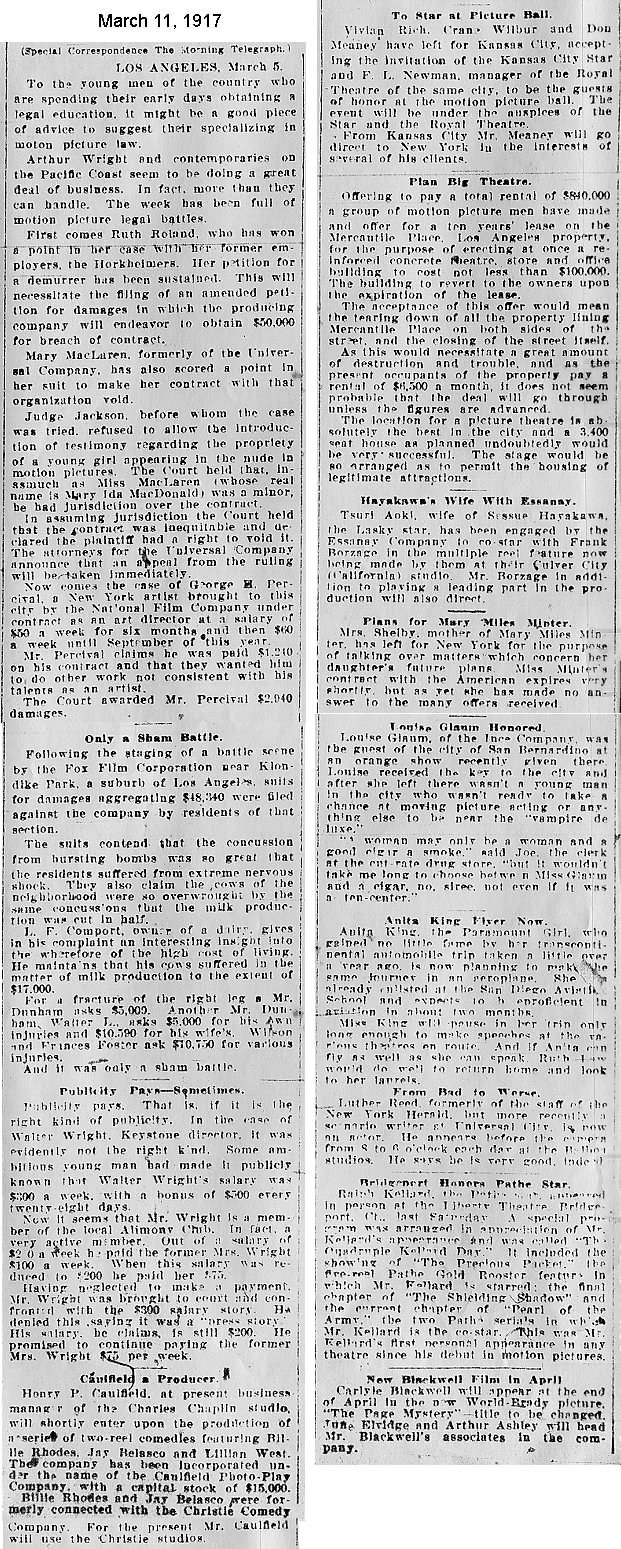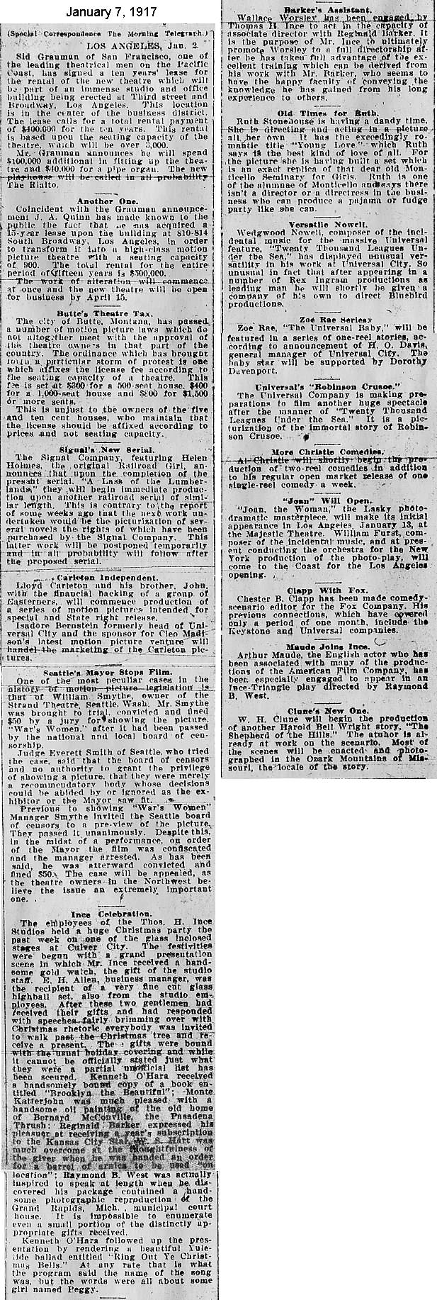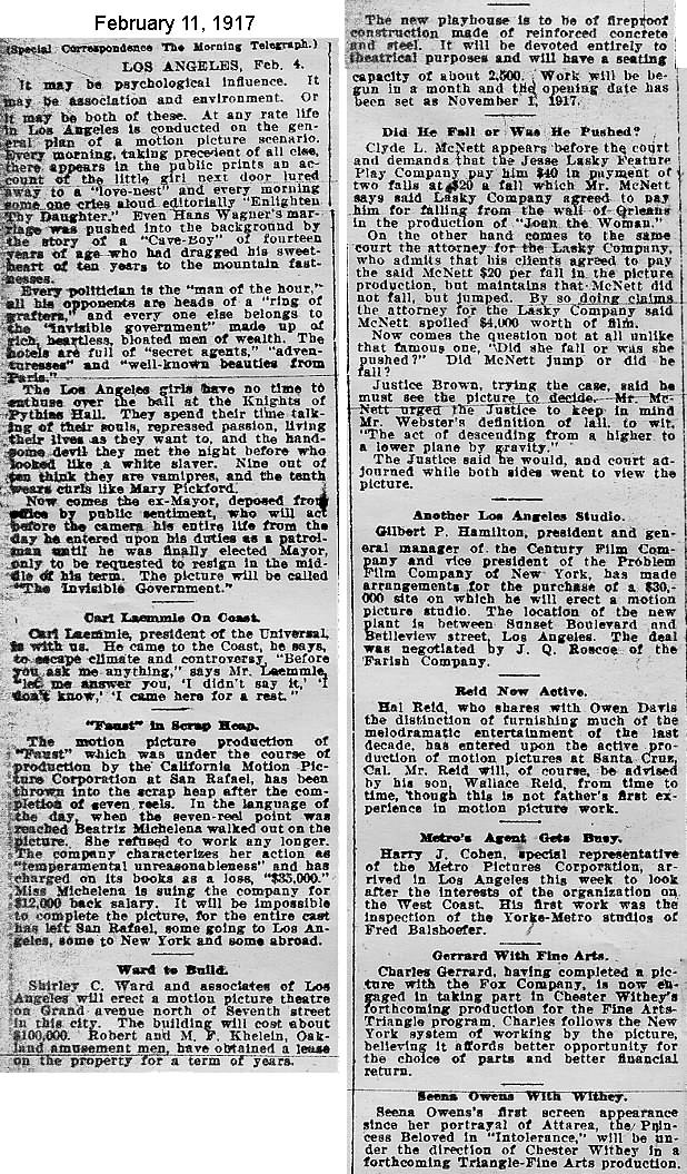 During the silent film era, the New York Morning Telegraph had more coverage of the film industry than any other daily New York newspaper; its coverage included a weekly column of movie news from Los Angeles, initially titled “Pacific Coast News.” As the film industry in Hollywood expanded, that column also grew in size. Many of the “news items” came directly from publicity agents, but they still provide a useful historic glimpse into Hollywood’s growing silent film industry. Major Hollywood news stories would have been given separate articles instead of a mention inside this column. The columnists of “Pacific Coast News” included Edward V. Durling, Clem Pope, Margaret Ettinger and Frances Agnew. During the 1980s, when I was seeking information on the film career of William Desmond Taylor, I cast my research net through a good number of newspapers, fan magazines, and movie trade publications. Since Taylor was directing in Southern California, I was surprised to find so many items on Taylor in the New York Morning Telegraph, which I had examined on microfilm obtained through interlibrary loan. Those columns of “Pacific Coast News” had so much information, and were so useful to me, that I photocopied them for future silent film references. Now, instead of just gathering dust in my garage, I have scanned those 1914-1922 “Pacific Coast News” columns for the web, so that anyone who is interested in silent film history will have access to the material. I did not photocopy the columns beyond February 1922, and the column was occasionally missing from the microfilm source material. Obviously, this material would be more useful if it were turned into word-searchable text instead of images. With the increasing availability of large amounts of free web space such as the Internet Archive, all available contemporary publications on silent film should be scanned and made freely available online, and I encourage people with copies of other contemporary silent film material to do so. In any event, I hope some of you will find useful information in these columns from the New York Morning Telegraph.