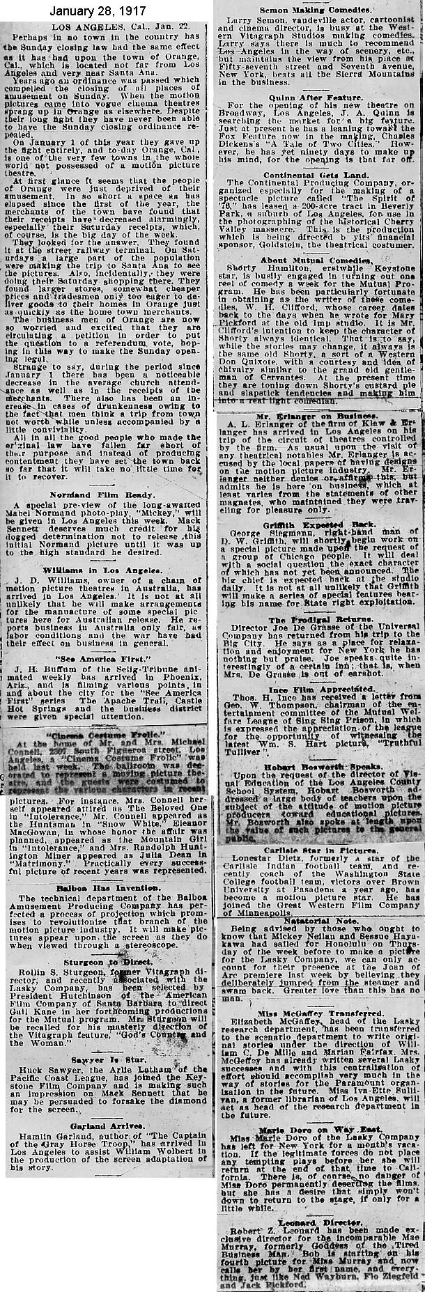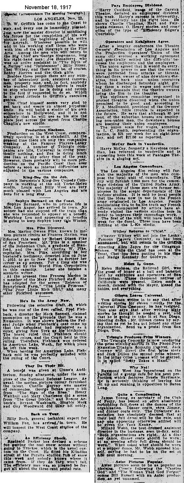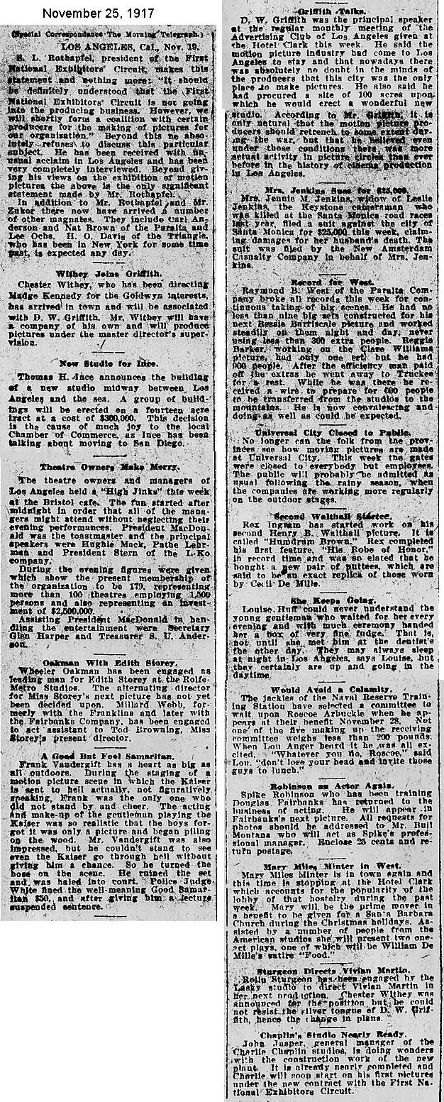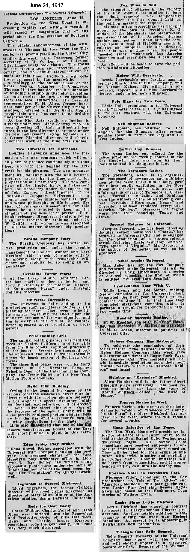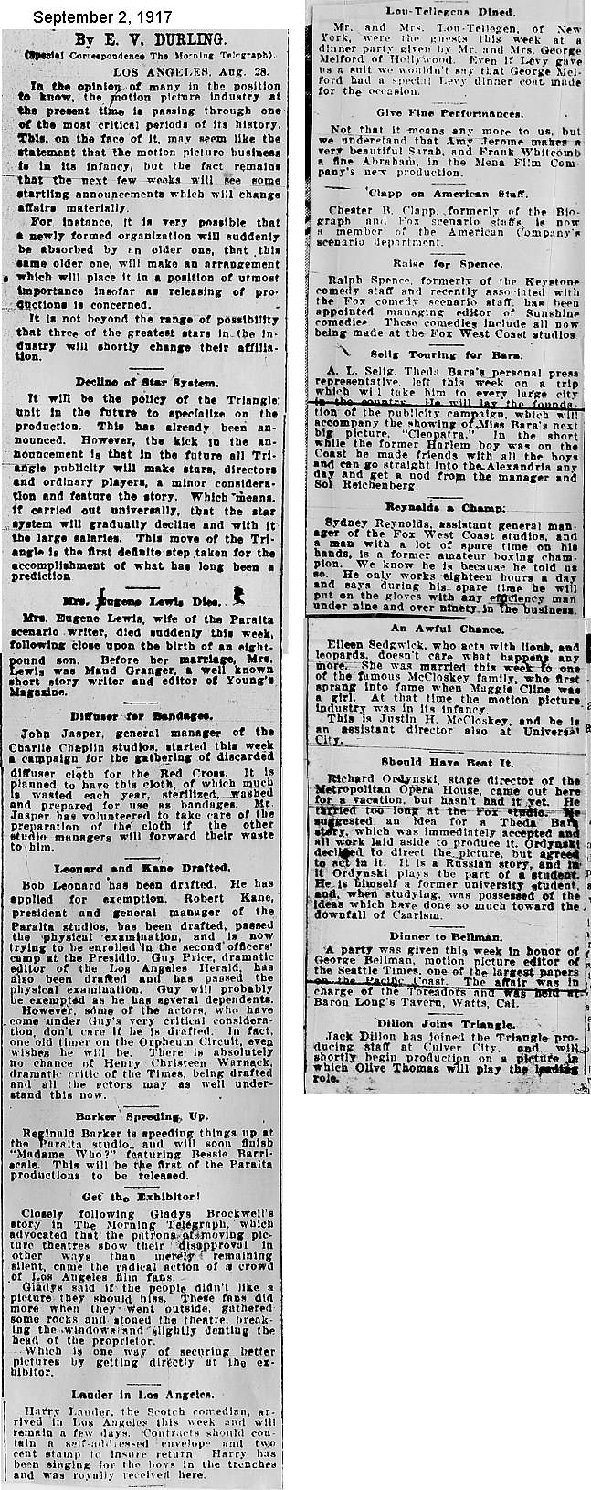 During the silent film era, the New York Morning Telegraph had more coverage of the film industry than any other daily New York newspaper; its coverage included a weekly column of movie news from Los Angeles, initially titled “Pacific Coast News.” As the film industry in Hollywood expanded, that column also grew in size. Many of the “news items” came directly from publicity agents, but they still provide a useful historic glimpse into Hollywood’s growing silent film industry. Major Hollywood news stories would have been given separate articles instead of a mention inside this column. The columnists of “Pacific Coast News” included Edward V. Durling, Clem Pope, Margaret Ettinger and Frances Agnew. During the 1980s, when I was seeking information on the film career of William Desmond Taylor, I cast my research net through a good number of newspapers, fan magazines, and movie trade publications. Since Taylor was directing in Southern California, I was surprised to find so many items on Taylor in the New York Morning Telegraph, which I had examined on microfilm obtained through interlibrary loan. Those columns of “Pacific Coast News” had so much information, and were so useful to me, that I photocopied them for future silent film references. Now, instead of just gathering dust in my garage, I have scanned those 1914-1922 “Pacific Coast News” columns for the web, so that anyone who is interested in silent film history will have access to the material. I did not photocopy the columns beyond February 1922, and the column was occasionally missing from the microfilm source material. Obviously, this material would be more useful if it were turned into word-searchable text instead of images. With the increasing availability of large amounts of free web space such as the Internet Archive, all available contemporary publications on silent film should be scanned and made freely available online, and I encourage people with copies of other contemporary silent film material to do so. In any event, I hope some of you will find useful information in these columns from the New York Morning Telegraph.