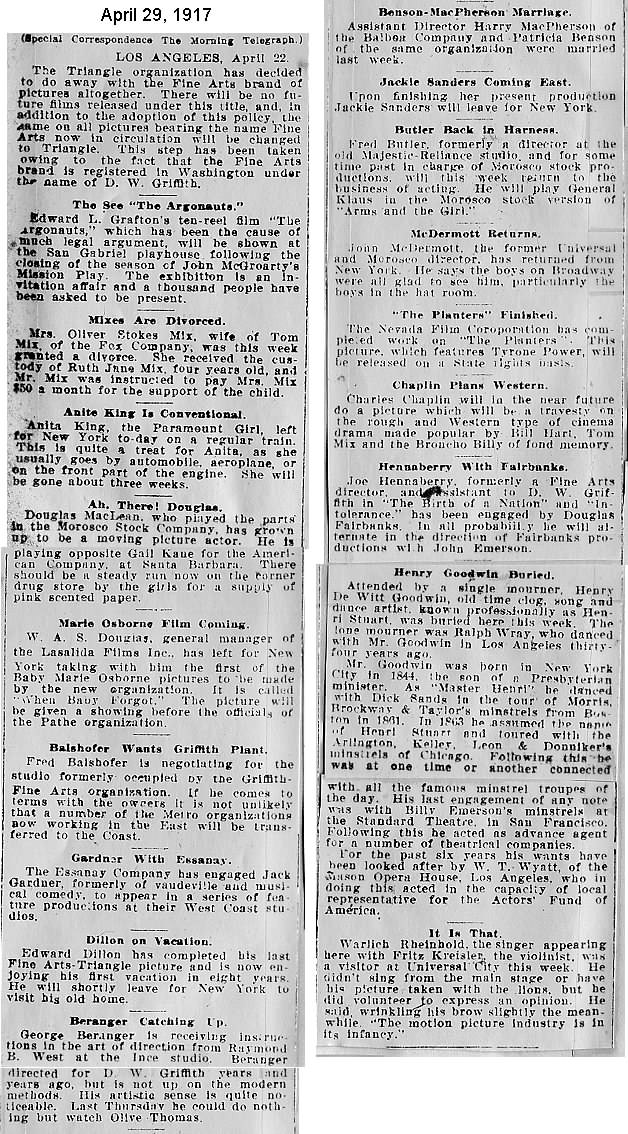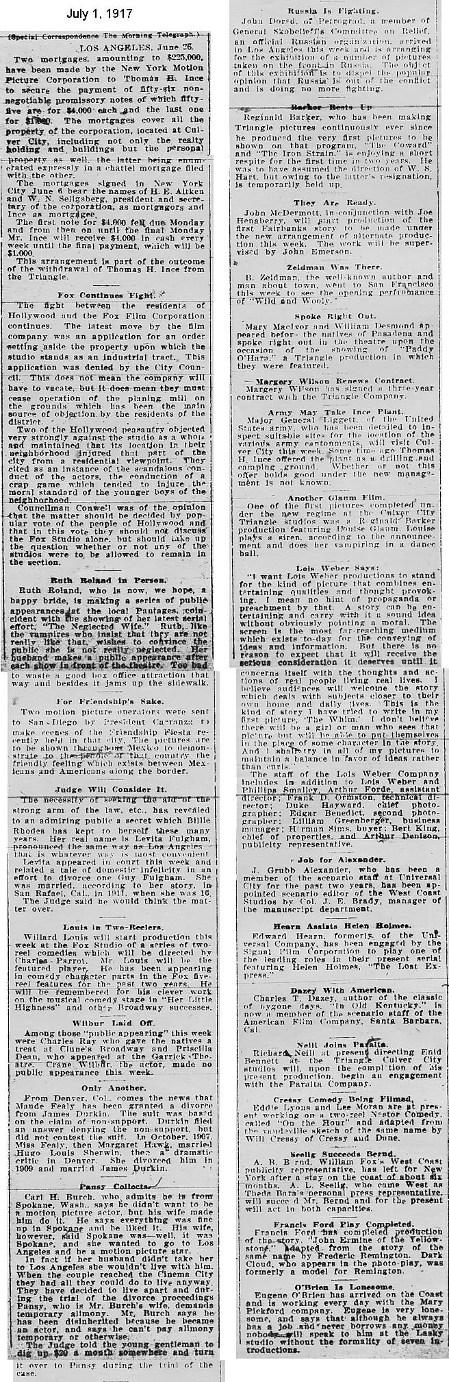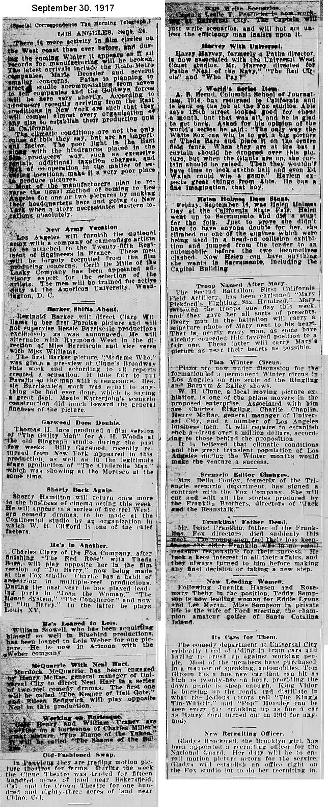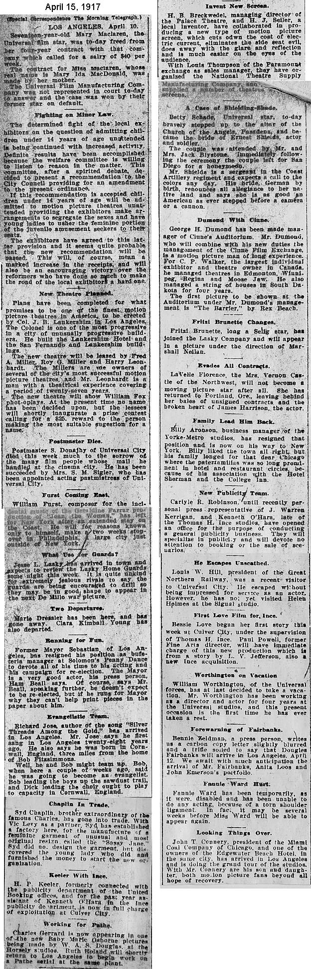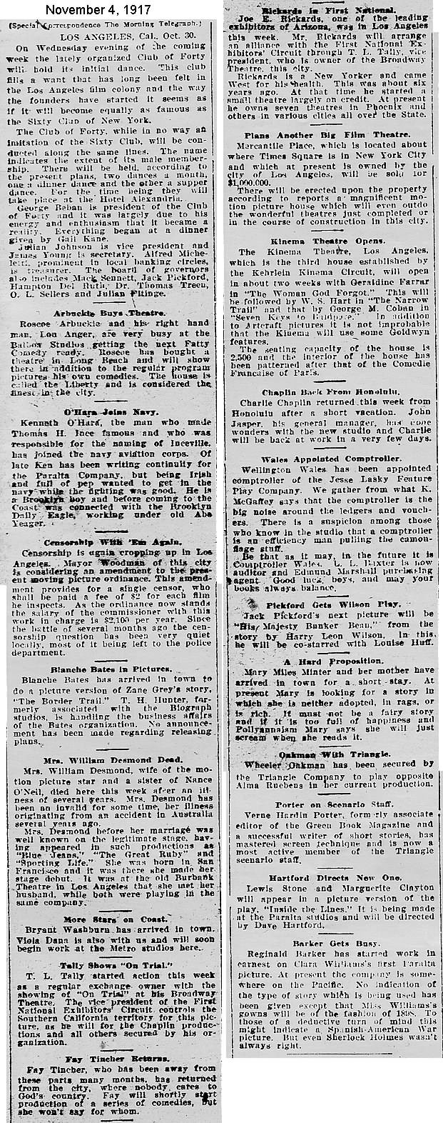 During the silent film era, the New York Morning Telegraph had more coverage of the film industry than any other daily New York newspaper; its coverage included a weekly column of movie news from Los Angeles, initially titled “Pacific Coast News.” As the film industry in Hollywood expanded, that column also grew in size. Many of the “news items” came directly from publicity agents, but they still provide a useful historic glimpse into Hollywood’s growing silent film industry. Major Hollywood news stories would have been given separate articles instead of a mention inside this column. The columnists of “Pacific Coast News” included Edward V. Durling, Clem Pope, Margaret Ettinger and Frances Agnew. During the 1980s, when I was seeking information on the film career of William Desmond Taylor, I cast my research net through a good number of newspapers, fan magazines, and movie trade publications. Since Taylor was directing in Southern California, I was surprised to find so many items on Taylor in the New York Morning Telegraph, which I had examined on microfilm obtained through interlibrary loan. Those columns of “Pacific Coast News” had so much information, and were so useful to me, that I photocopied them for future silent film references. Now, instead of just gathering dust in my garage, I have scanned those 1914-1922 “Pacific Coast News” columns for the web, so that anyone who is interested in silent film history will have access to the material. I did not photocopy the columns beyond February 1922, and the column was occasionally missing from the microfilm source material. Obviously, this material would be more useful if it were turned into word-searchable text instead of images. With the increasing availability of large amounts of free web space such as the Internet Archive, all available contemporary publications on silent film should be scanned and made freely available online, and I encourage people with copies of other contemporary silent film material to do so. In any event, I hope some of you will find useful information in these columns from the New York Morning Telegraph.