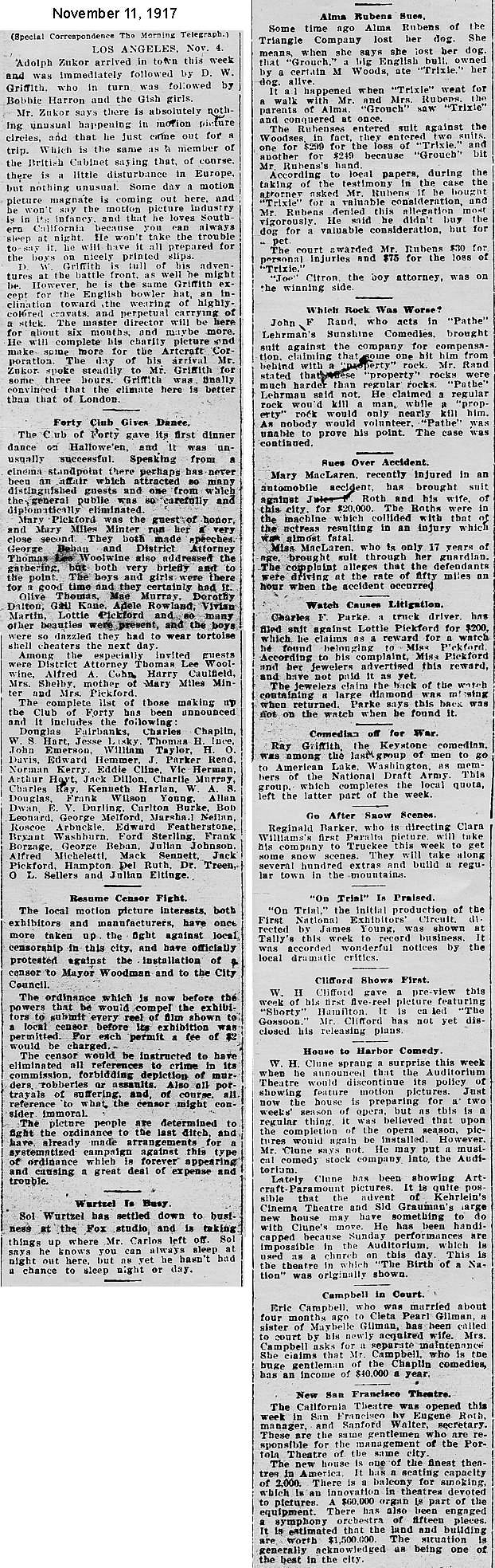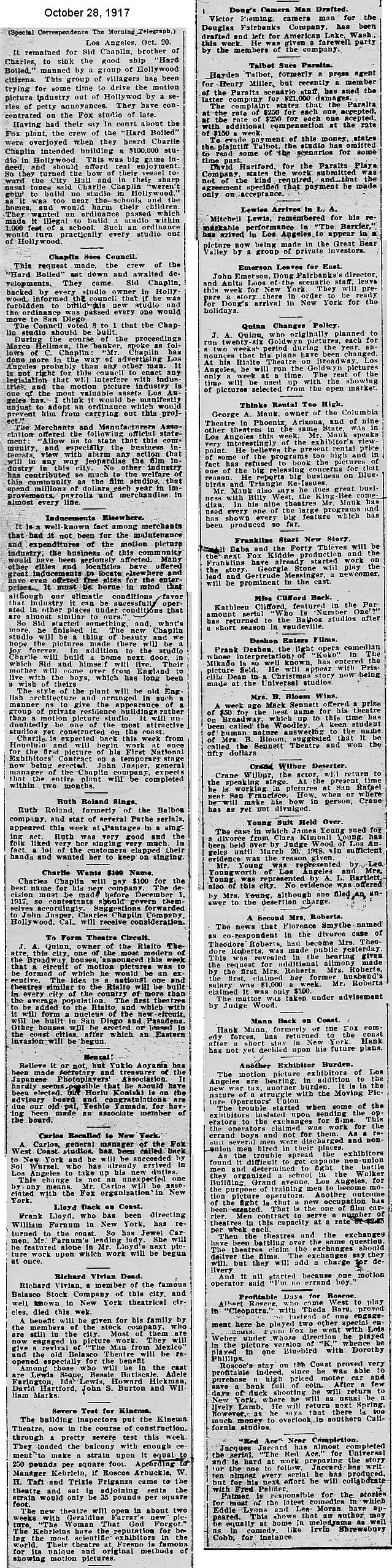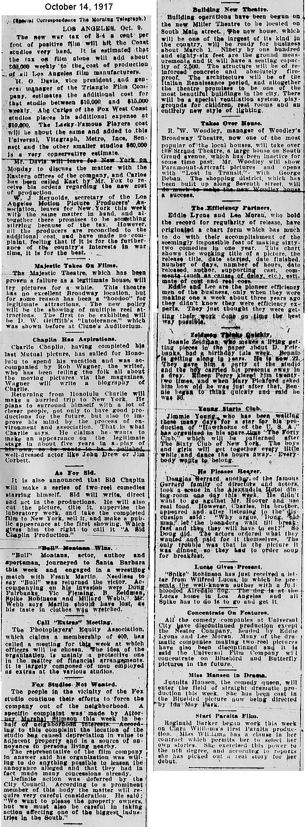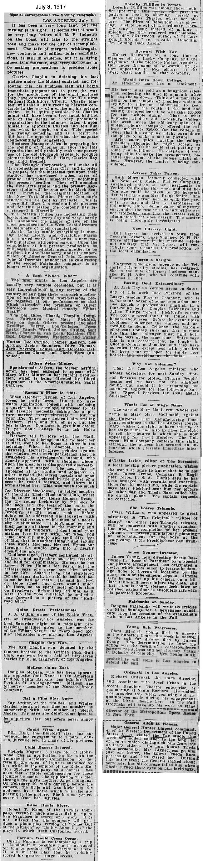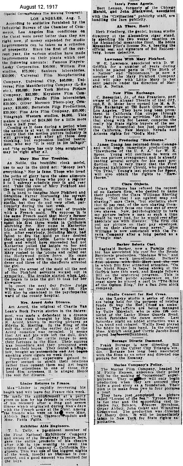 During the silent film era, the New York Morning Telegraph had more coverage of the film industry than any other daily New York newspaper; its coverage included a weekly column of movie news from Los Angeles, initially titled “Pacific Coast News.” As the film industry in Hollywood expanded, that column also grew in size. Many of the “news items” came directly from publicity agents, but they still provide a useful historic glimpse into Hollywood’s growing silent film industry. Major Hollywood news stories would have been given separate articles instead of a mention inside this column. The columnists of “Pacific Coast News” included Edward V. Durling, Clem Pope, Margaret Ettinger and Frances Agnew. During the 1980s, when I was seeking information on the film career of William Desmond Taylor, I cast my research net through a good number of newspapers, fan magazines, and movie trade publications. Since Taylor was directing in Southern California, I was surprised to find so many items on Taylor in the New York Morning Telegraph, which I had examined on microfilm obtained through interlibrary loan. Those columns of “Pacific Coast News” had so much information, and were so useful to me, that I photocopied them for future silent film references. Now, instead of just gathering dust in my garage, I have scanned those 1914-1922 “Pacific Coast News” columns for the web, so that anyone who is interested in silent film history will have access to the material. I did not photocopy the columns beyond February 1922, and the column was occasionally missing from the microfilm source material. Obviously, this material would be more useful if it were turned into word-searchable text instead of images. With the increasing availability of large amounts of free web space such as the Internet Archive, all available contemporary publications on silent film should be scanned and made freely available online, and I encourage people with copies of other contemporary silent film material to do so. In any event, I hope some of you will find useful information in these columns from the New York Morning Telegraph.